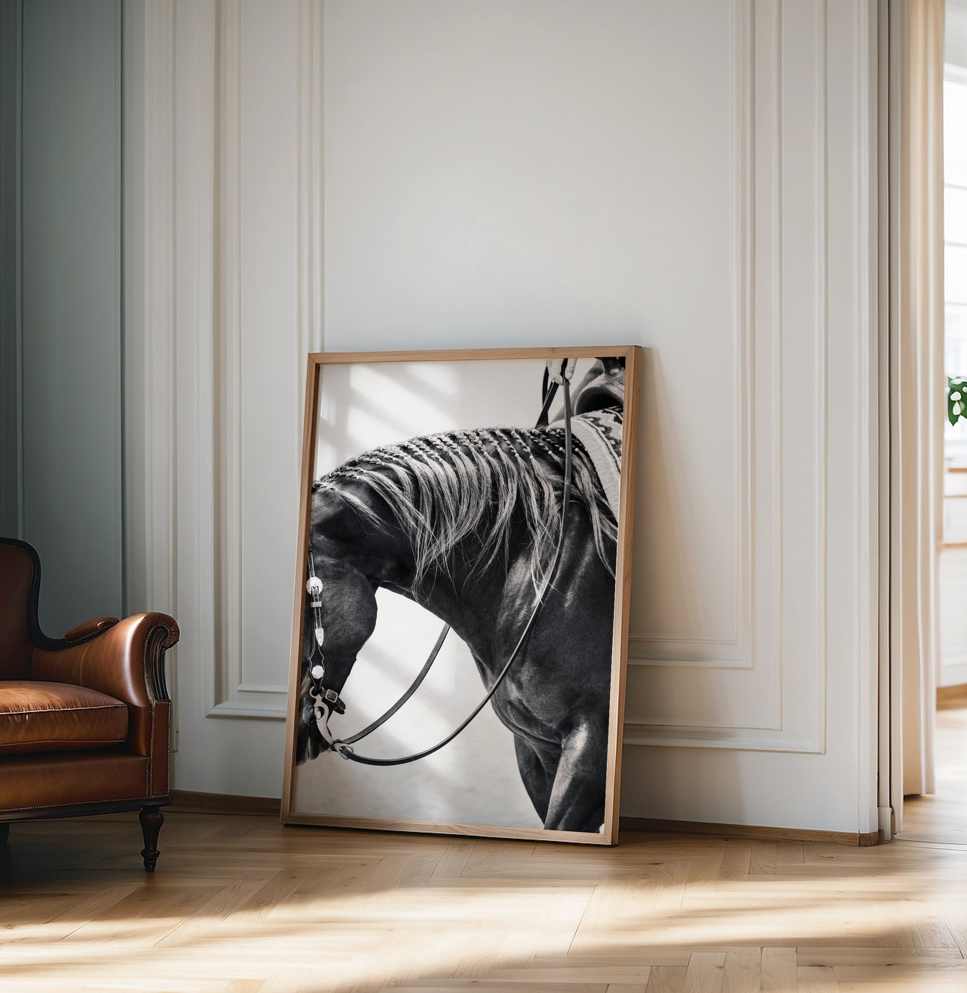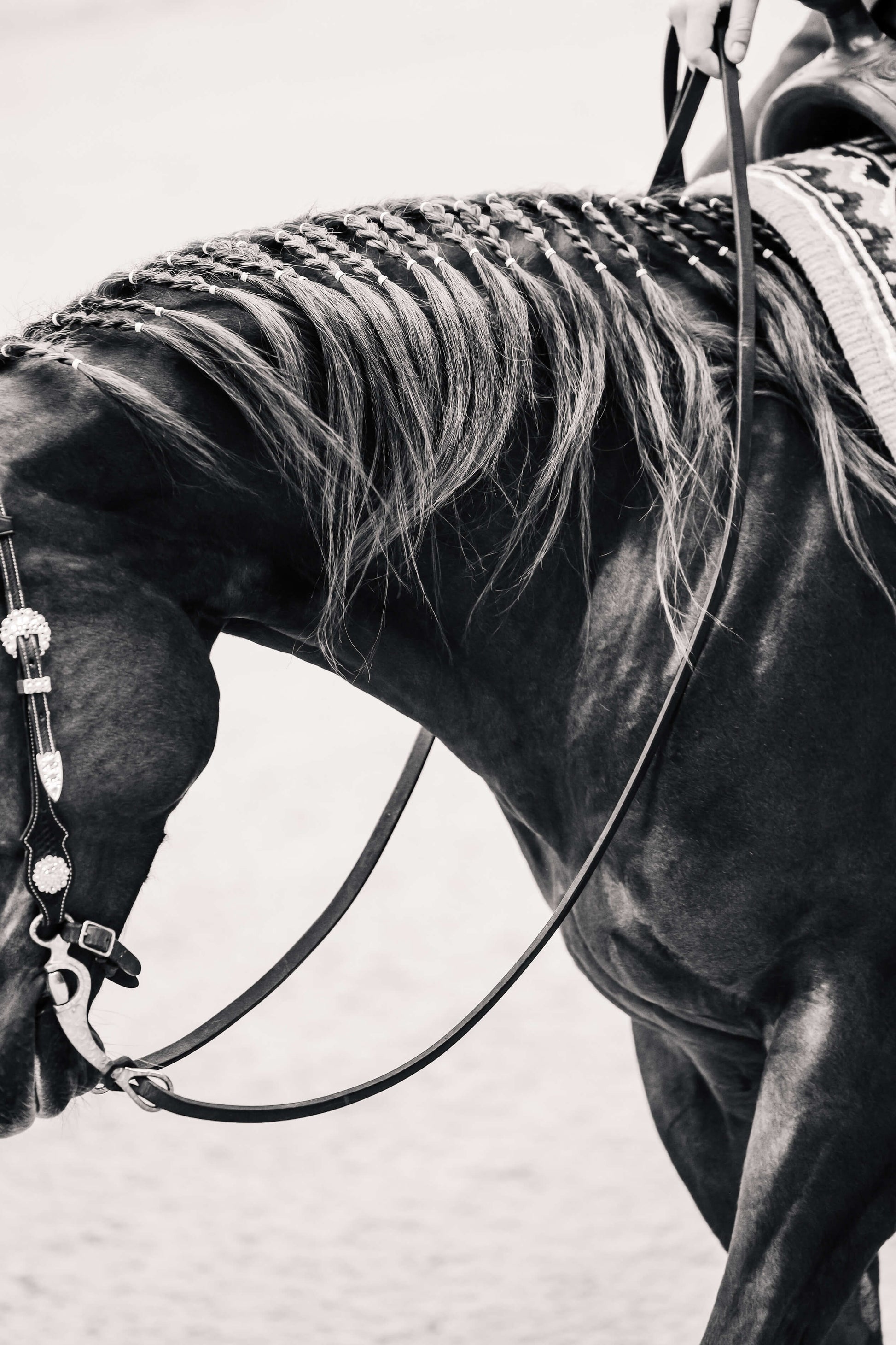 The composition steals the viewer's eyes onto the reining horse's small hair braids, which are rhythmically repeating on the horse's dark shades. The braids, made on the occasion of a sports celebration event, end in a semi-circle that is continued by an even wider one shaped by the rein.